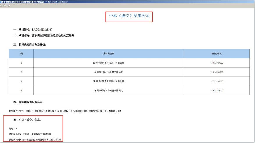 2021年4月29日,深圳公共資源交易中心發(fā)布中標(biāo)公告:深圳市三盛環(huán)保科技有限公司中標(biāo)西鄉(xiāng)街道家庭廚余垃圾收運(yùn)處理服務(wù)。
