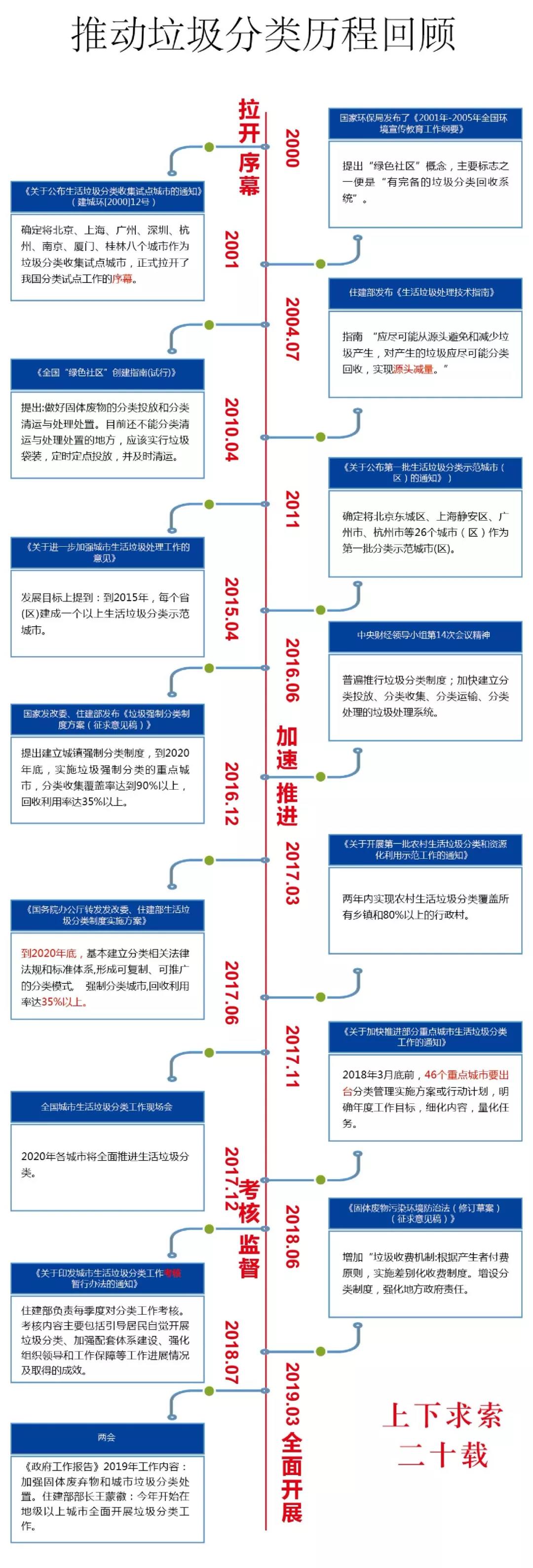 追溯我國20年來垃圾分類的發展歷程,可以看到大體經歷了“拉開序幕-加速推進-考核督察-全面展開”四個階段,目前我國的垃圾分類工作正走上新的征程。
